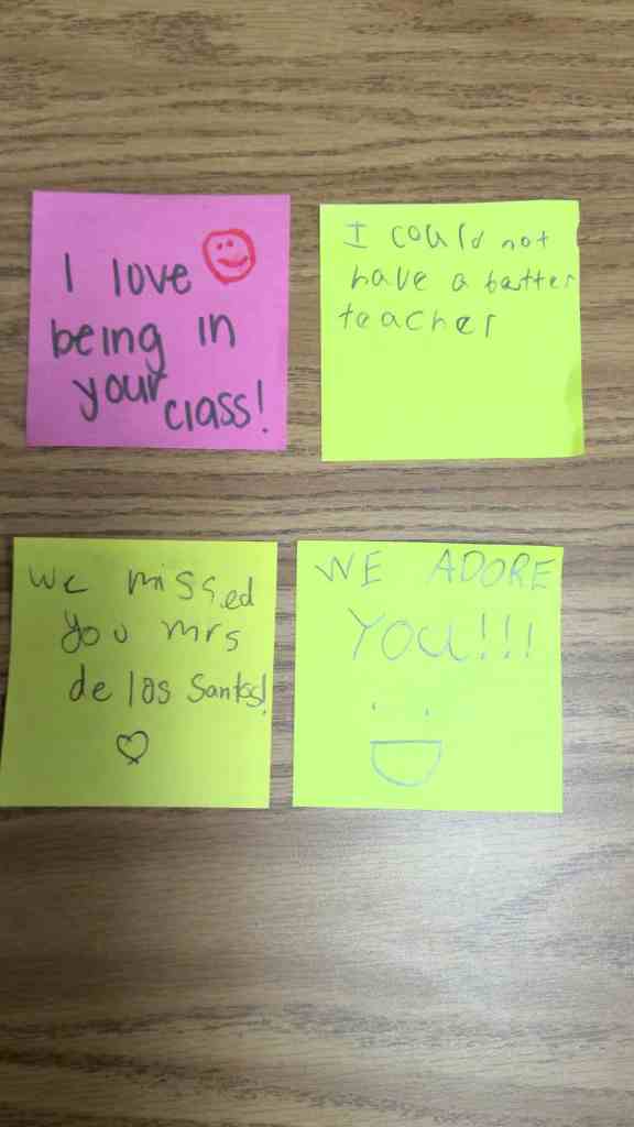 These kids showed up for me in a big way. Upon reaching my classroom door, I noticed a post-it note stuck to it. It said, “We missed you!” I smiled and thought about how lucky I was to have this class. I still felt bad for leaving them. Boy, did they show me what real love and kindness are.